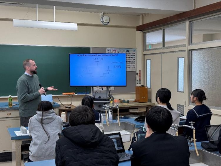 講師として、京都大学から、ナノスケールにおけるMOF触媒反応の解析とモデル化について研究されているDaniel Sven Patrick Hedbom先生と段上翔太朗先生をお迎えしました。英語での講義にもかかわらず、生徒は集中して聴講し、積極的に参加していました。専門的な研究内容に加えて、スウェーデンの文化や生活、研究者としての経緯、研究者に求められる資質についてもお話しいただき、生徒たちは興味を持って講義に参加することができました。