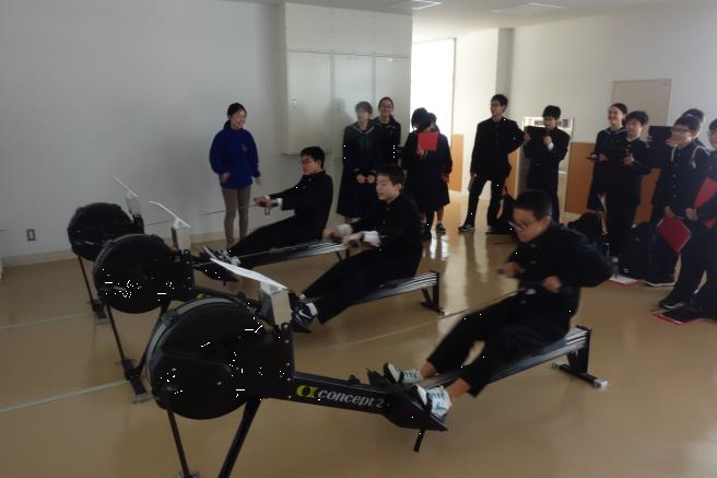 美浜町の町技であるボート競技をイメージした発電機を使い、発電体験を行いました。2人一組もしくは1人で、ローイングエルゴメーターで300m漕ぐとどれだけ発電できるのかを競うものであり、生徒は張り切って漕いでいたが、負荷が思いのほか大きく、戸惑っていル様子でした。