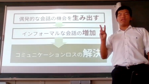 二人は「コロナ禍でのコミュニケーションロスへの対応」というテーマでプレゼン動画を作成しました。その中で、各自がネット上にアバターを所持し、アバター同士が出会う際にオンライン通話ができるシステムによって、偶発的・流動的なインフォーマル会話の機会を生み出して減少したコミュニケーションを補う、という提案が示されました。