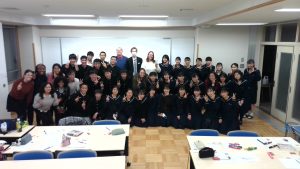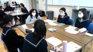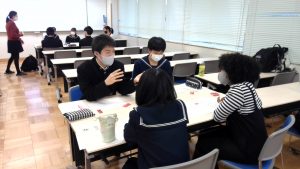令和3年2月5日(金)・12日(金)、本校にて英語コミュニケーション研修を開催しました。参加者は、高志高生38名と福井県の中・高等学校ALT11名。1人のALTに対して3~4人の生徒という少人数グループに分かれ、遺伝子工学、キメラ(2種以上の組織を持つ生物)、家族の在り方など様々なトピックについて話し合いました。参加者はみな笑顔で、ときには大きなジェスチャーを使いながら、積極的、論理的に自分の考えを伝え合いました。「ALTはフレンドリーで、難しい内容を色んな表現で言い換え、分かりやすく説明してくれました。」「理由や例を挙げて一生懸命話し、相手に理解してもらえると嬉しかったです。」など、充実した時間が過ごせたことが伝わる感想がたくさんありました。