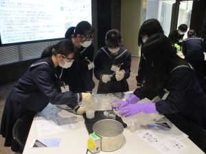日華化学で扱っている界面活性剤の主力商品の一つであるトリートメントについて学んだあと、実際にトリートメント作りに挑戦しました。