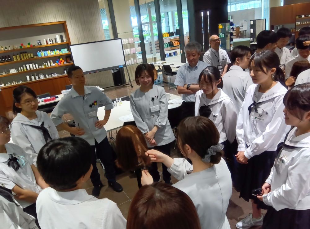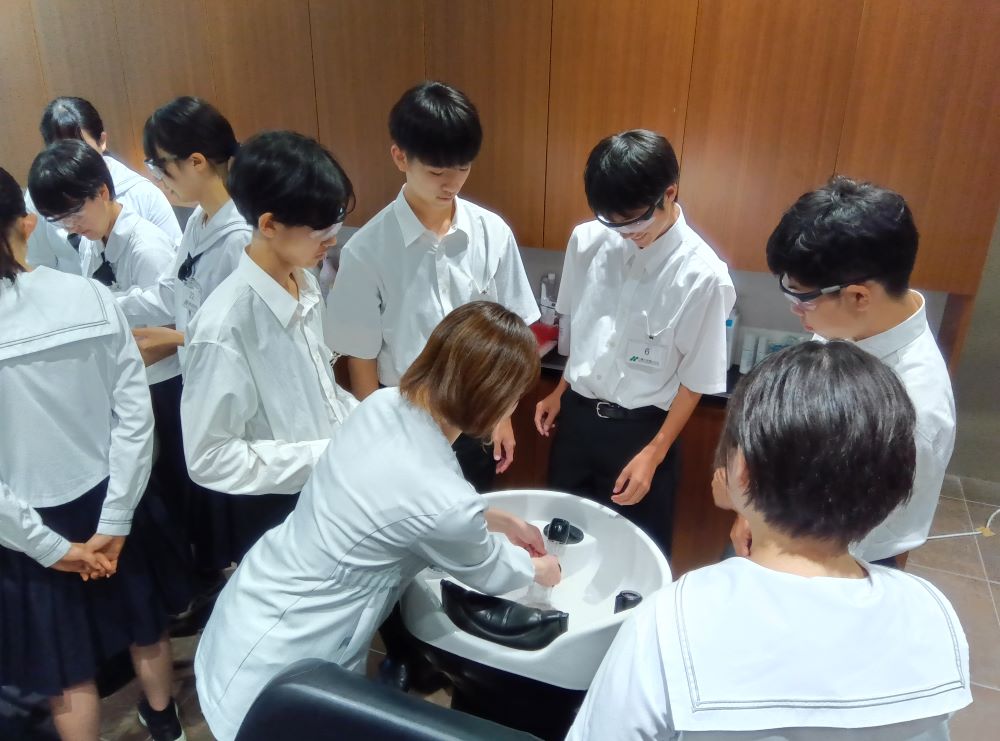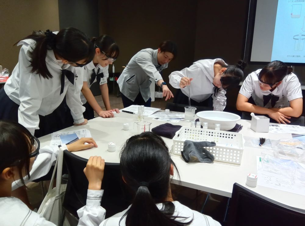 次に,研究員による界面活性剤の働きに関する講義を受けた後,異なる活性剤で2種類のトリートメント作りに挑戦し,その効果の違いを検証する実験研修を行いました。