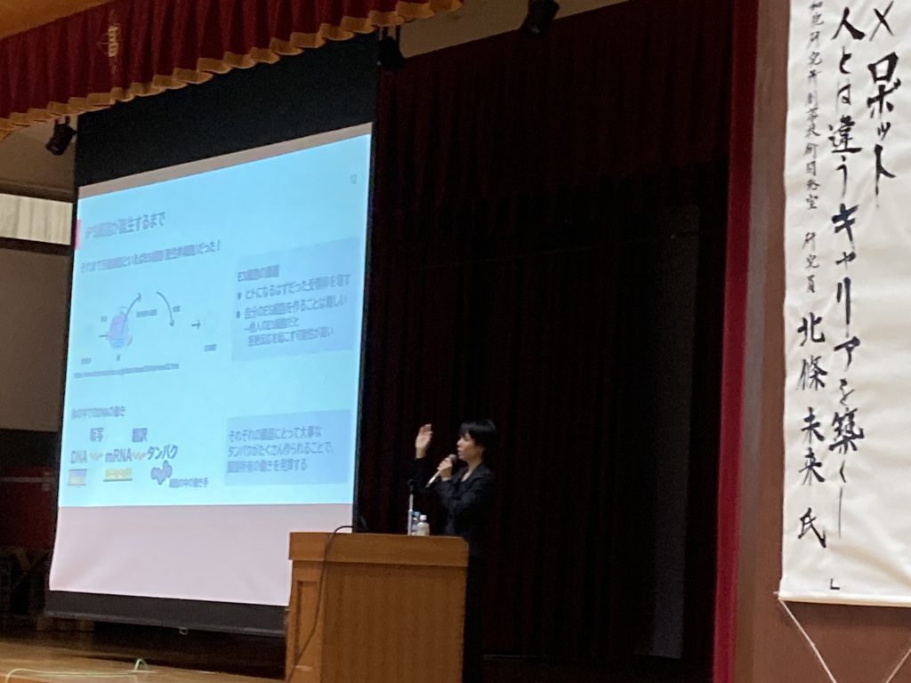11月16日(木)に、アステラス製薬株式会社の研究員で京都大学iPS細胞研究所に勤務する北條 未来(ほうじょう みき)先生を講師にお招きし、「iPS細胞×ロボット~人とは違うキャリアを築く~」のテーマでSSH講演会を開催しました。