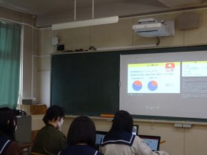 探究活動プレゼンテーション部門に出場し、『福井県の消費応援キャンペーンアプリ「ふく割」を活用したプラスチック削減の方法』をテーマに発表を行いました。プラスチックゴミの削減というグローバルな課題を解決すべく、福井県庁や地元の商店・企業への聞き取り調査をもとに、「ふく割」のポイント制度に着目したプラスチック使用量の削減案を提案しました。