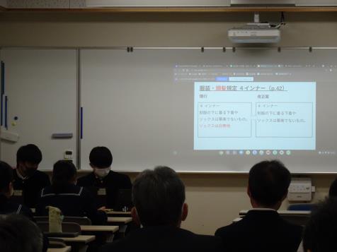 令和3年度には、校則検討委員会を設置し検討を重ね、生徒・教職員だけでなくPTAや同窓会の方々の意見を聞く場も設けました。さらに、全生徒・全教職員に対するプレゼンテーション、生徒・保護者に対するアンケートの実施を経て、令和4年1月に新校則施行となりました。