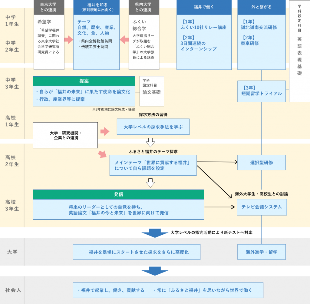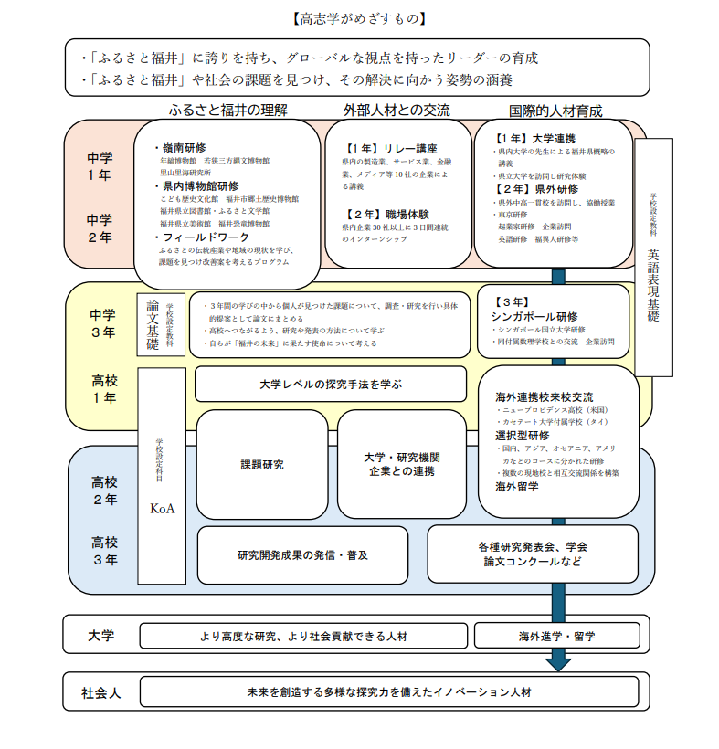 「ふるさと福井」に対する誇りとグローバルな視野を持って新しい分野にチャレンジする姿勢を育てるために、高志中学校・高校が独自に設定した6年間の学習。「ふるさと学習プログラム」「キャリア形成プログラム」「課題探究プログラム」を3つの柱としています。